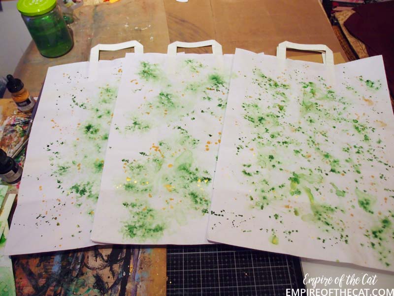 I realised that as I would be dropping off gifts days before Christmas instead of taking them with me to someone’s house on Christmas day as per usual, I would need to put them in some kind of bag, except I didn’t have any bags… or did I? I remembered that I had some plain white paper bags that I bought ages ago for craft fairs, so I dug some out and thought I would throw some paint on them for a bit of colour. I automatically reached for my favourite turquoise ink but then thought maybe since it’s winter/Christmas, maybe I should go for something green and foresty looking, so I picked out the green ink instead and started spattering it over the gift bags. Then I sprayed them with water and when the water hit the ink I knew I had made the right choice! just look at that colour! Since they were for Christmas I thought I would add some splatters of gold ink to make them a bit more festive. I was only going to do one side but I like it so much that after the first side was dry, I did the other side of the bags.