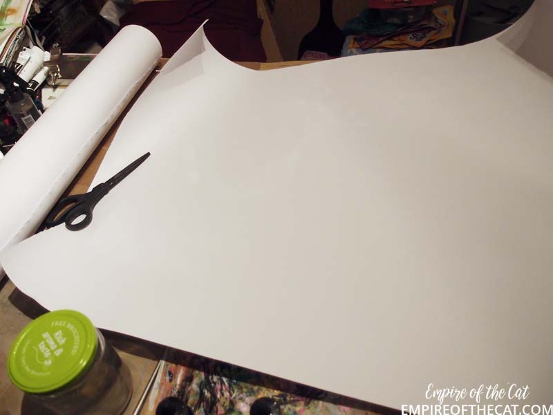 Meanwhile, while the bags were drying, I cleared off my table (by dumping everything on the floor and regretting that lol) and rolled out some white paper and decided to make gift wrap to wrap the presents that were going in the bags! This paper is A1 width which is two steps up from A3. I will need to check but it’s probably about 50cm width.