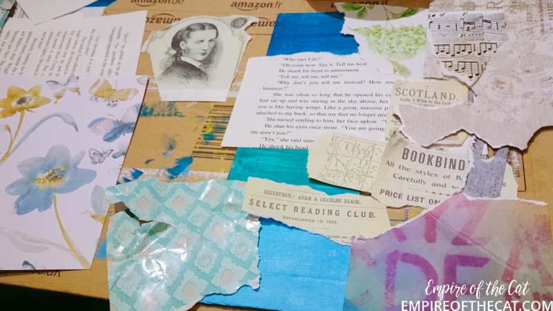 It was then time for a bit of collage, so I pulled out some bits and pieces of paper scraps that might work with the colour palette and the book theme.