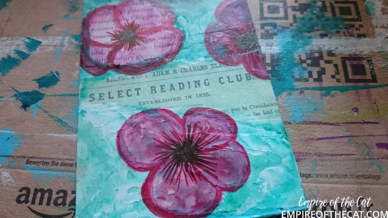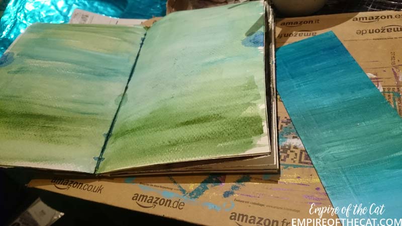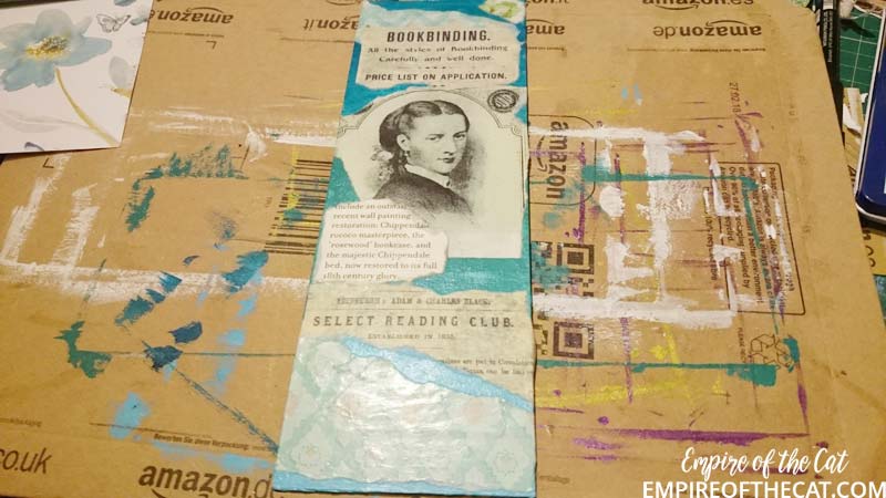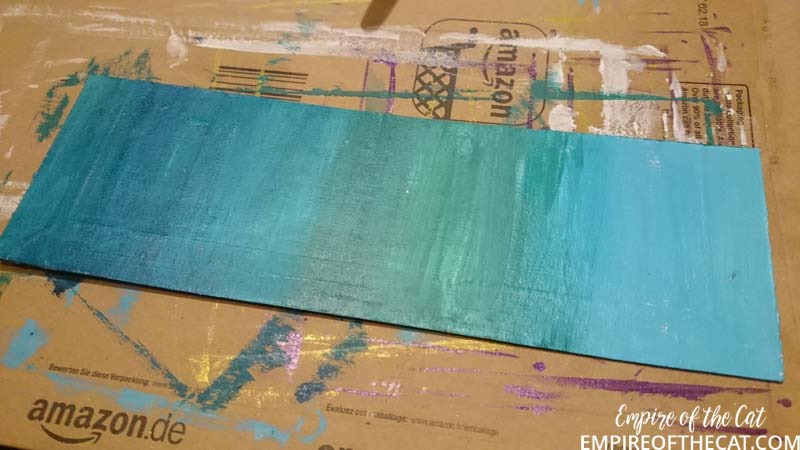 I glued the two pieces of amazon box cardboard together to make a sturdier bookmark. Then I painted what was going to be the back of it, with this teal colour, really just to disguise that it was an amazon box lol.