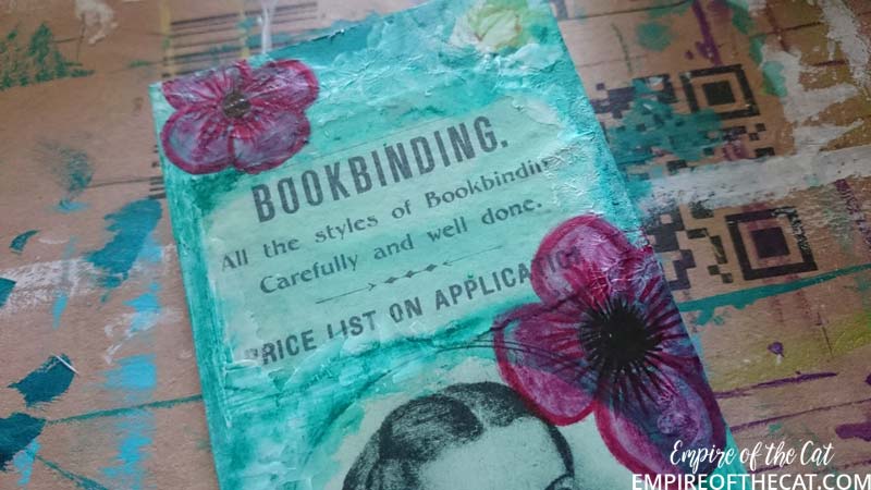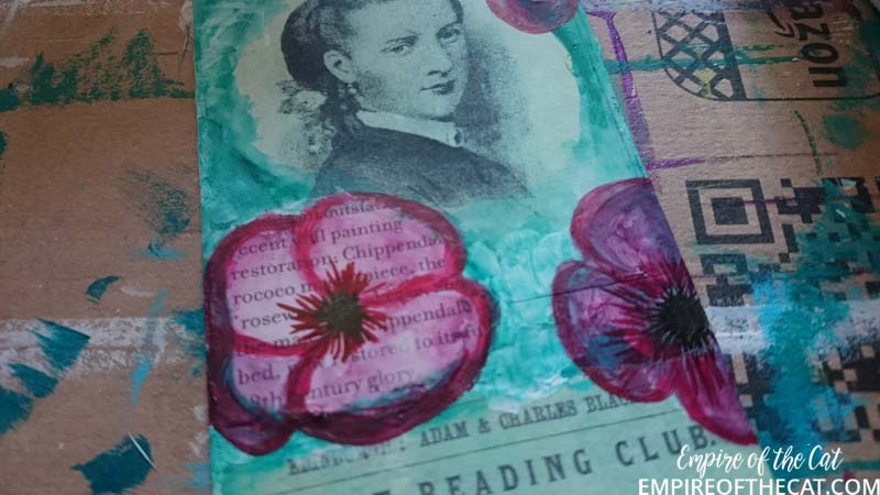 More tiny bits of collage, gift wrap, some of my papers that I printed at home, including this rather dour looking woman who I can imagine being some kind of strict governess or a librarian who does not appreciate it when you return your book late!