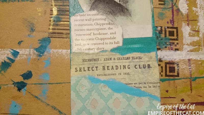 Most of these little scrap papers are leftovers from other projects, for example the piece above that talks about Chippendale furniture and a rosewood bookcase (appropriate right?) came from the art journal spread about the visit to Dumfries House. The diamond patterned paper is gift wrap from a present I received from a friend and I am getting so much use out of that as well as the actual present!
