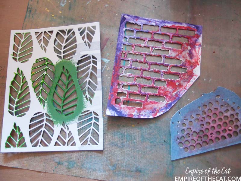 I often use homemade stencils made from paper or cardboard and they can be very effective and last a surprisingly long time. Here’s an example of some of my homemade stencils which have been made using cardstock and cut using dies. They were all intended for short term use but I have been using them for well over a year now and the one in the middle with the brick pattern, has been used so often and with all kinds of mediums and yet it is still in good condition! I really didn’t expect it to last past the first project I used it for and yet here it is, still fully functional and ready for business!