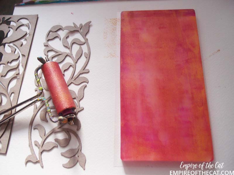 Using acrylic paint and a brayer, apply some acrylic paint to the gel plate, making sure to keep it light and even and smooth, then place the chipboard stencil on top.