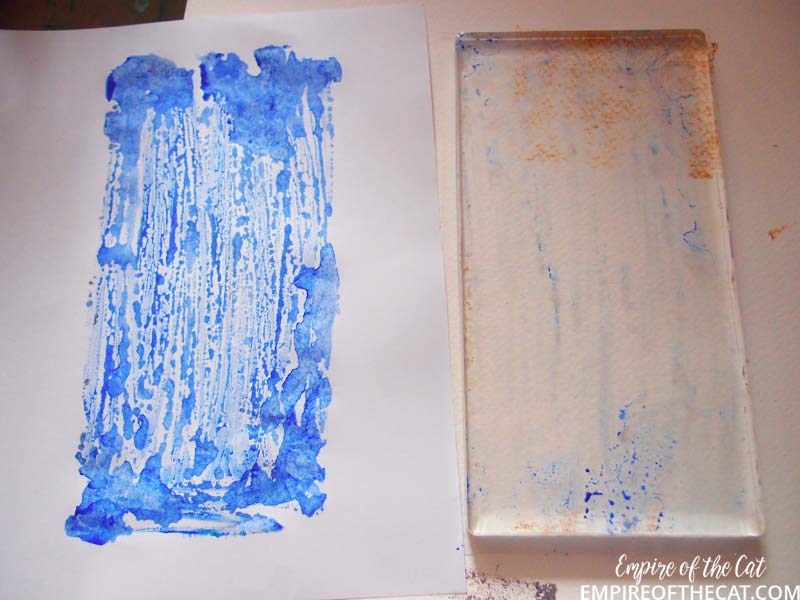 Place some printer paper on top and burnish with the brayer or your hands, same as before and voilà, a nice watercolour background.
