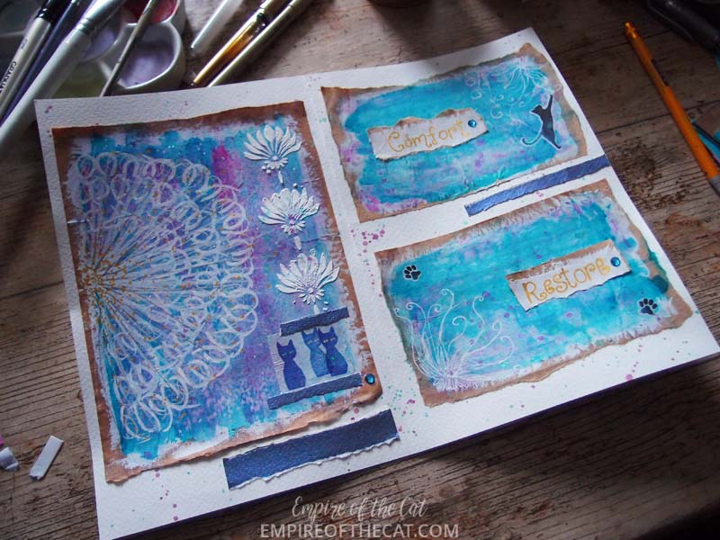 This lesson used a technique that was similar to one I’ve used before on Christmas cards.. Trying to get this technique to work was another reason that this lesson took so long. I set up a few different pages as I wasn’t sure which of them would work but in the end, I decided to use all three of them because I hate waste. This post is all about the one on the bottom right, I will write up the remaining one later, there are too many photos for just one post!