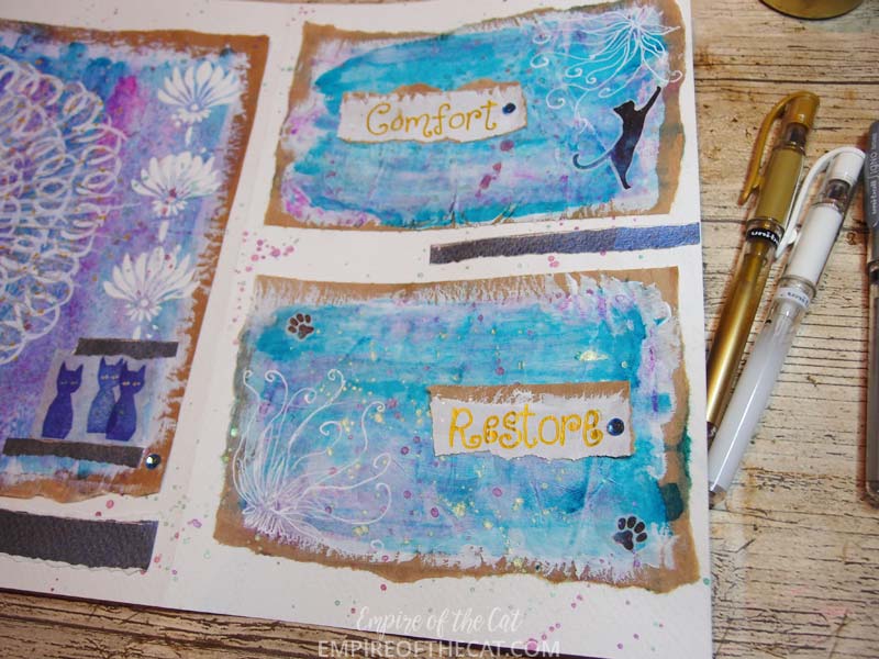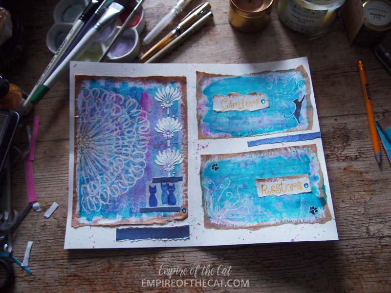 Art Journal Journey – February Challenge – Heavy Metal – gold pen, silver pen, blue and purple metallic watercolour splatters, dark blue metallic acrylic strips