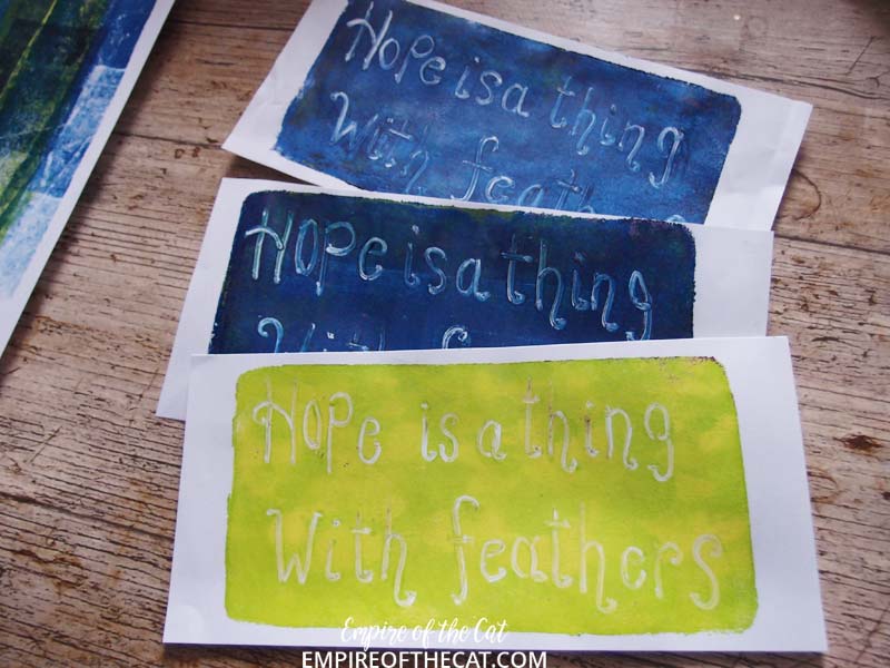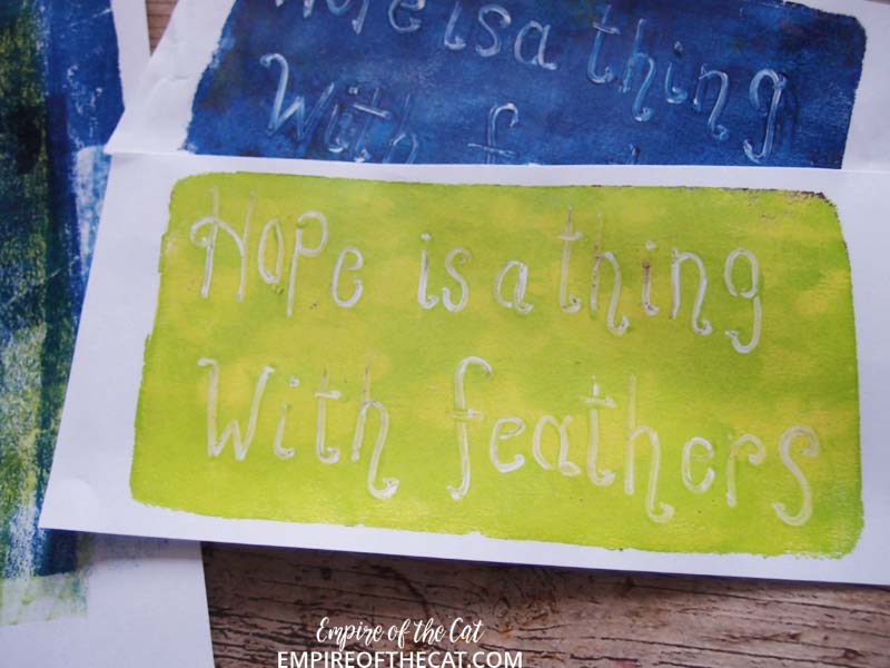 I’ve been practising my lettering lately but it was extra challenging to try and write backwards! I used a not-very-sharp pencil to write this quote into the paint. I didn’t want to scratch my plate! Maybe it was the feather prompt from day 5 that reminded me of this quote or maybe it was this recent journal page, but it had to be done.