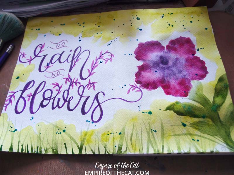 Hello everyone! I’ve not been feeling that great lately for various reasons but today is my birthday and so I decided to spend it doing something creative and relaxing, so I got out my watercolours and painted this art journal page with this big imaginary flower. I don’t really know what kind of flower it is but it does remind me a little bit of an anemone, but that might just be the colours. I also did some hand lettering of this quote: NO RAIN NO FLOWERS