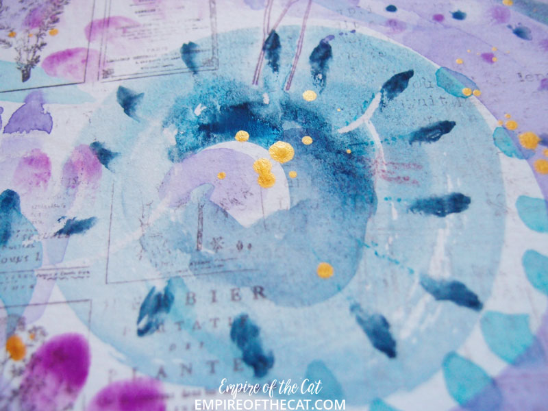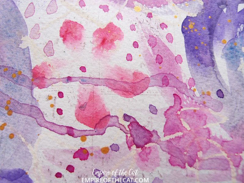 watercolour paper, watercolour paint, polychromos, black pencil, gold ink, gold pen, stazon ink, stamps, neocolour II, distress ink,