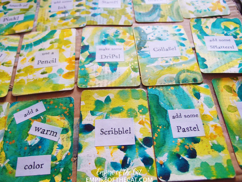 Hello again, here we are again at the start of another week. I hope your Monday is going well for you. Today I am sharing some photos from one of the Life Book 2021 lessons, this time it’is these lovely “Art Flow” cards from last week’s lesson from Laly Mille. I do a lot of watercolour anyway and seem to be making a lot of card decks lately so her lesson combining both these things was right up my street! I feel like I’m in a bit of a slump and I am super tired due to some person health problems and some kitty health problems and I just feel exhausted. So I thought I would shut myself away in my studio {happy place} and make these cards. It was just what I needed!