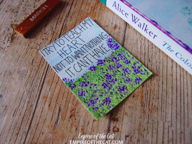 I don’t know what kind of purple flowers Celie references in the book as she talks about a field of purple, so I made some up using various purples. It looks quite impressionistic close up.