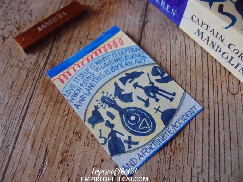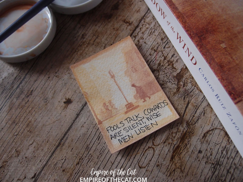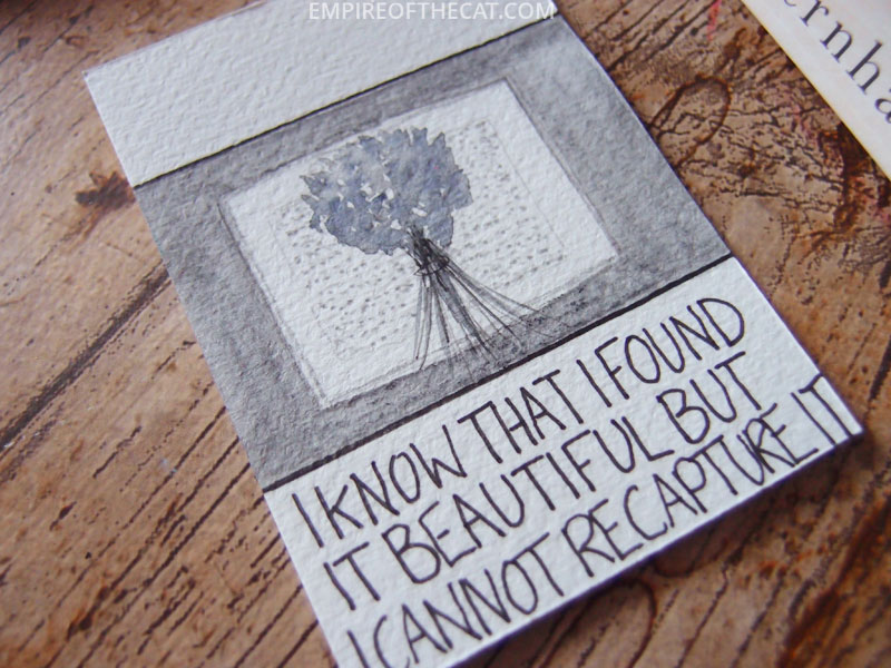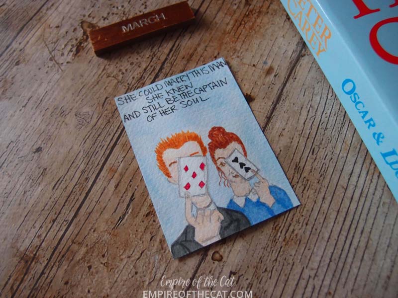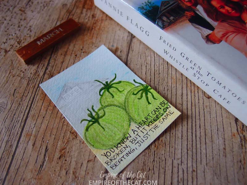 Anyway, looks like we are over the worst and so I did more of my book cover ATCs for the #100DayProject, and I’m pleased to say I have caught up (for now anyway). As I was doing this and I do them all in different ways, it occurred to me that some of them might actually qualify as “paintings” albeit very small paintings, and so I have created this special post for the only the ATCs that I created this weekend that were painted. I have not included the ones that were not “painted” but they will be seen anyway on instagram and in my round up posts which I do for every 10 days. So before I share the little painted covers, here are the links to all the covers so far in case you need to see them. You can find a detailed post for my Day 1 project where I went into the ins and outs of what I was doing, and here is a look at the first ten days, days 11-20, days 21-30, days 31-40, and days 41-50. Days 51-60 will be finished and posted next week.