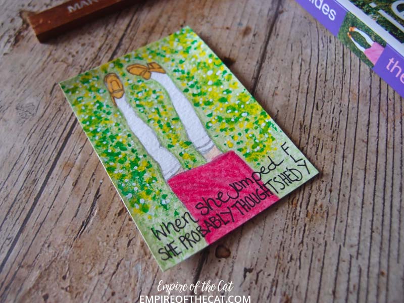 This last one is one of my favourites. I like taking photos along the way but this week/weekend has been so stressful that when I got time to paint I forgot the camera and didn’t want to lose valuable creating time to get it, so this one is the only one where I got to take a photo of the sketch. Watercolour over the sketch then lots of acrylic paint pen over the top for flowers in the grass.