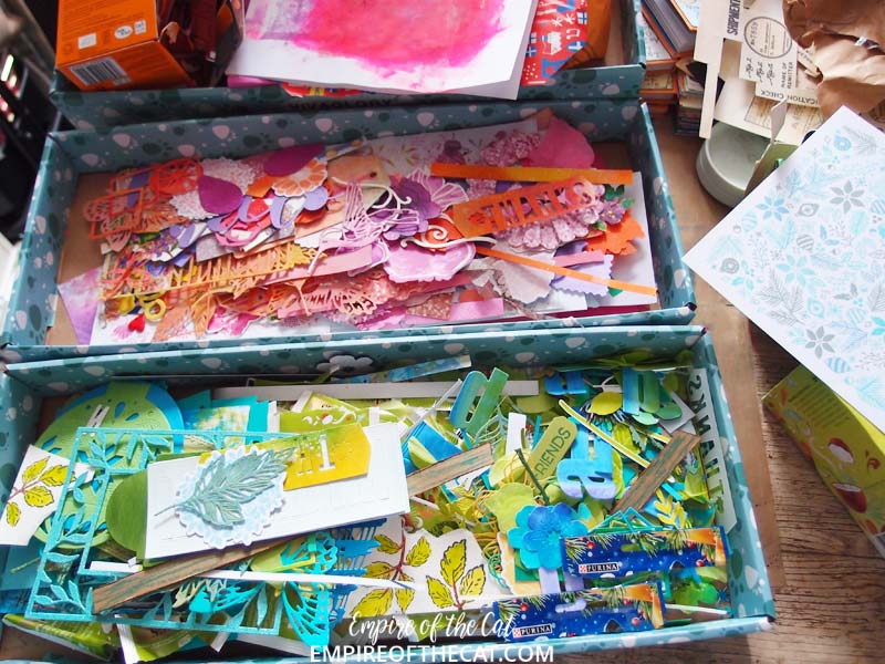 When all the tidying and sorting was over, I had some boxes of ready-to-use colour co-ordinated bits and pieces which I would call ephemera or collage fodder or maybe even my precioussss. Gotta say it looks a lot better like this, all separated by colour than it did when it was a big pile on my desk before I started the clean up. It feels better and much more calming to look at, as well as being a little more inviting.