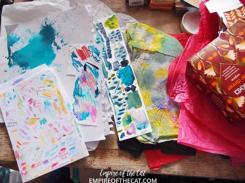 Hello friends and welcome back to another blog post, this time for Day 12 of the Blog Along with Effy (details below) and I can also wish you a Happy Monday and hope that your week will be good. Here’s what I did yesterday – a bit of a clean up and organise day in the studio. First I have all of these lovely papers which are the result of my most recent gel printing efforts. These are not monoprints from the plate, these are the papers I use to clean off my brayer but they always turn out so lovely and beg to be used, so I oblige.