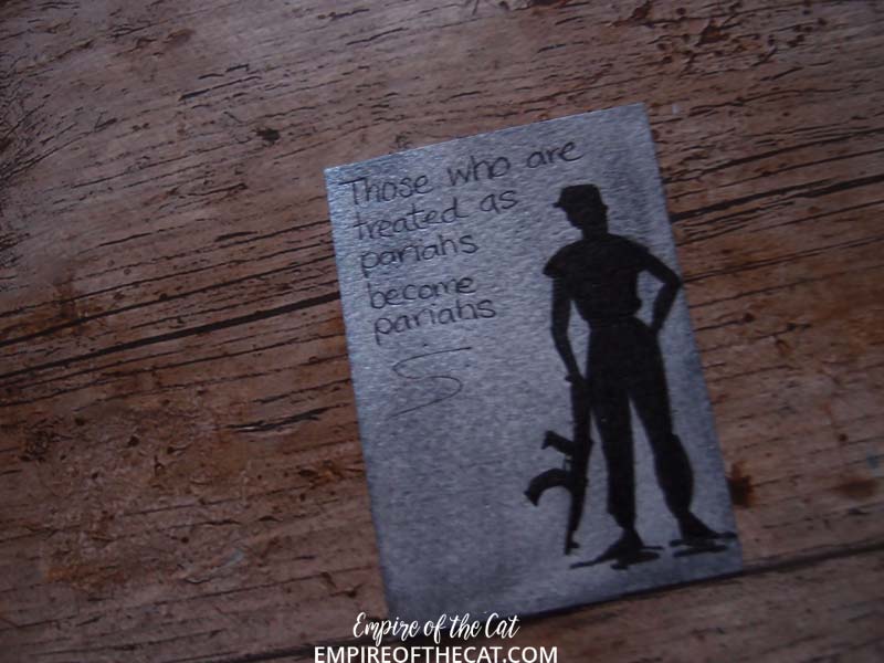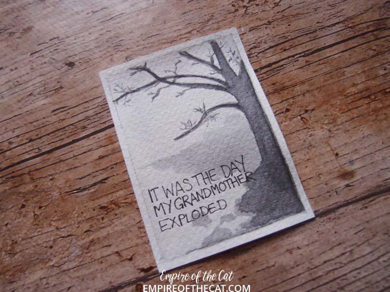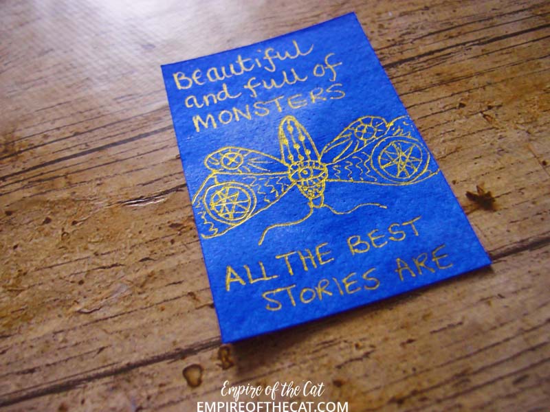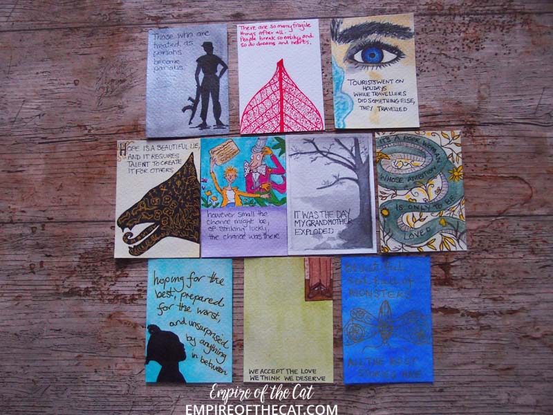 So why ATCs and why these books? Well in order to make it easier on myself and therefore make it more likely that I could do all 100 days, I thought ATCs would be perfect. Then I thought of book quotes handwriting them, perfect way to practice my lettering and also indulge my love of books. So what books? The first 25 books are all books with elements of magic in them (fantasy, supernatural, urban fantasy, vampires, witches, werewolves etc) and then I changed to modern fiction and so on but now with only 30 books left I have some difficult choices to make! As with the first 25 books, all books must be taken from my shelves and be actual physical books, no ebooks, no audiobooks! I have also started taking elements from the book covers and incorporating them in the ATCs so they are starting to look like mini book covers and we’ve been playing “name that book” in our book group lol. [icon name=”book-reader” style=”solid” class=”” unprefixed_class=””]