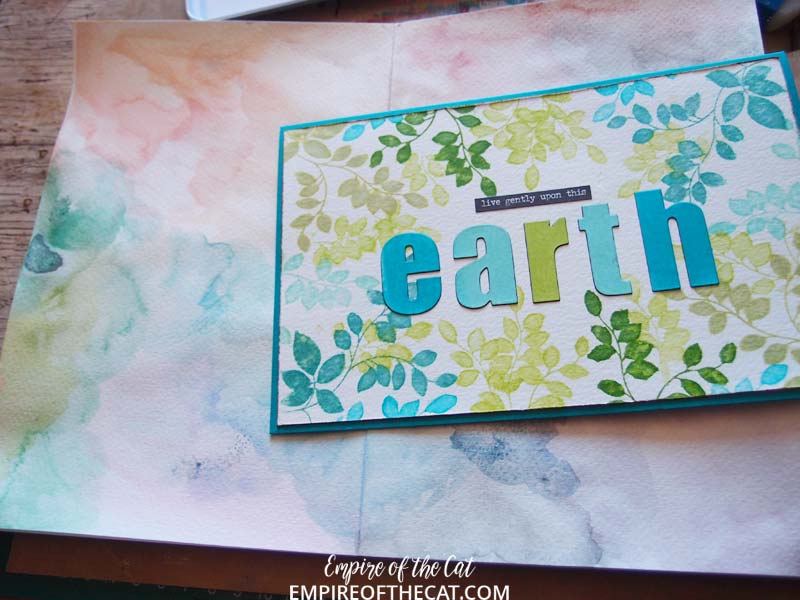 So after my fun day of swatching, it was time to make my Earth Day journal page, but after all that swatching I didn’t really feel like doing my original idea. I had these two bonus pages in my journal, made from cleaning my brush, so why not use one of those instead, right?