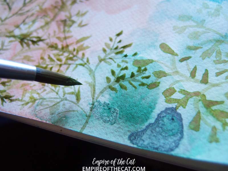 And you know, instead of pulling out all the supplies that I used on the original card, why not just use these earth mineral paints and make a very low tech version by just painting on the leaves with a brush!