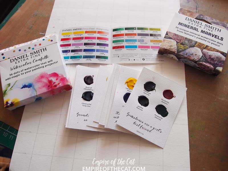 However, I spent the day swatching some new paints that arrived this week. (I love swatching and swatch anything that has a colour!) I was very excited to see what they looked like as they are the new big dot packs from Daniel Smith! Here’s what they look like:
