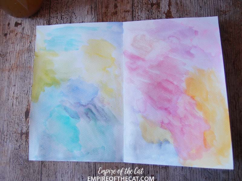 This Watercolour Confetti box has a nice range of bright colours and some different types of watercolours including some of his iridescent colours and a couple of the Primatek colours. While I was painting my little swatch squares I was also cleaning my brush off on a page in my journal so as not to waste any paint.