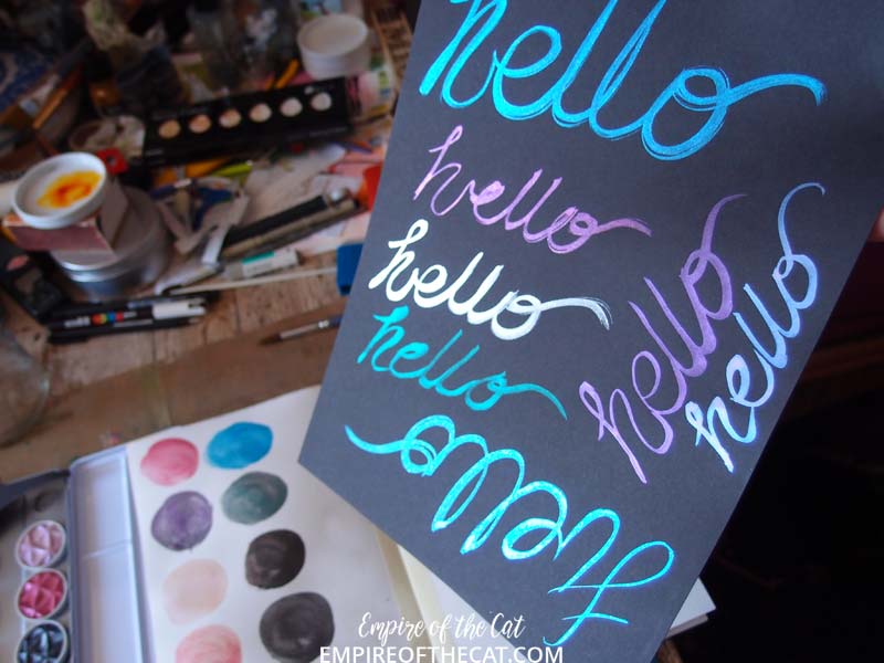 As I mentioned before some of the paints in the Confetti box are iridescent, so I thought I would show a comparison between those and my favourite iridescent paints. It’s not really a fair comparison as the colours are different but I still think the Finetec are better (sorry Daniel Smith).