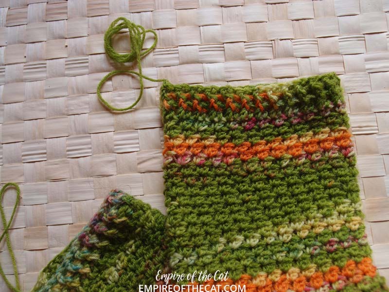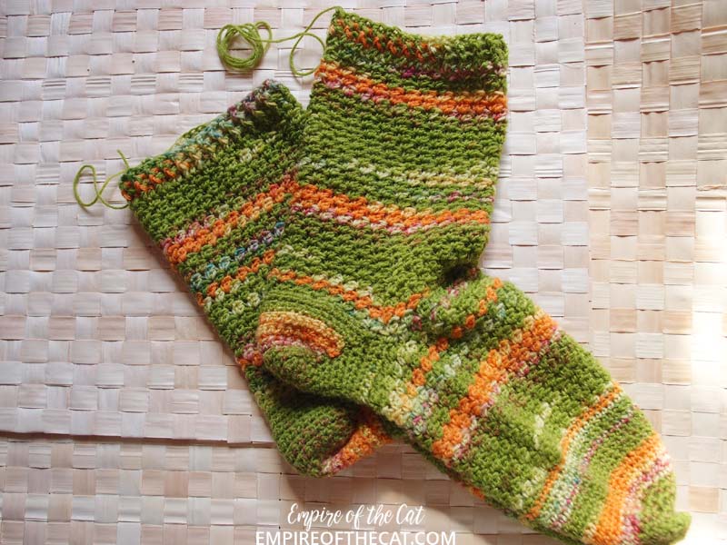 Then with a bit of front post/back post crochet magic, turns into a sort of rib-like cuff on the ends which finishes them off nicely with just a little bit of yarn left to weave in. It’s great to wear the socks finally and also to check something off the UFO list!