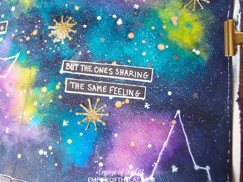 I also added some tiny iridescent stars to the page using some white glue.  You can see a few of them on the image below, some looking silver and one in the middle looking blue as the light hits it.
