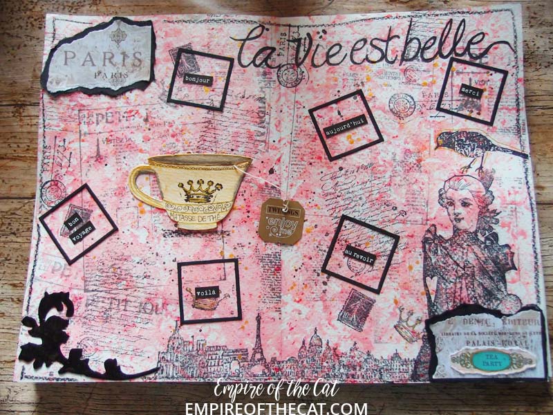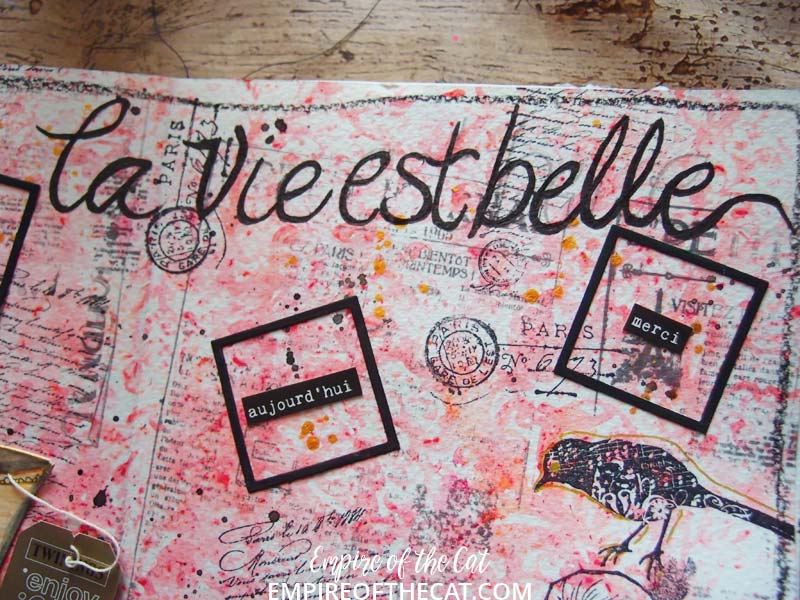 Some Paris postmark stamps from Tim Holtz and then I wrote La Vie Est Belle across the top of the page, which can mean Life is Good or Life is Beautiful.