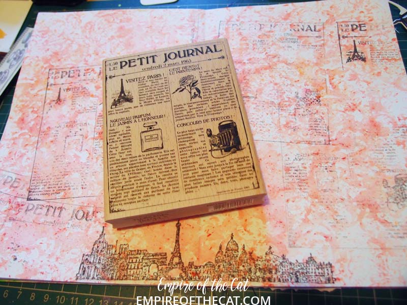 Also on the background are a few smaller Tim Holtz stamps that are in French script and a smaller French dictionary stamp.