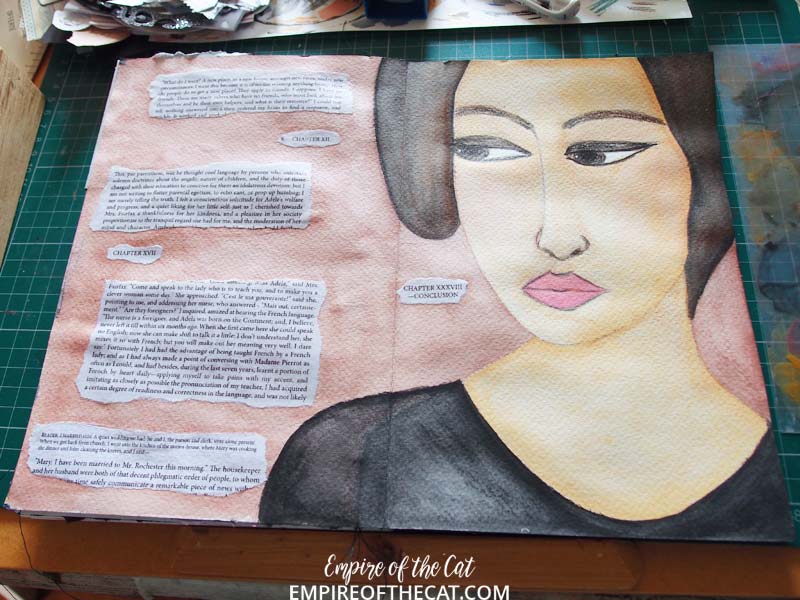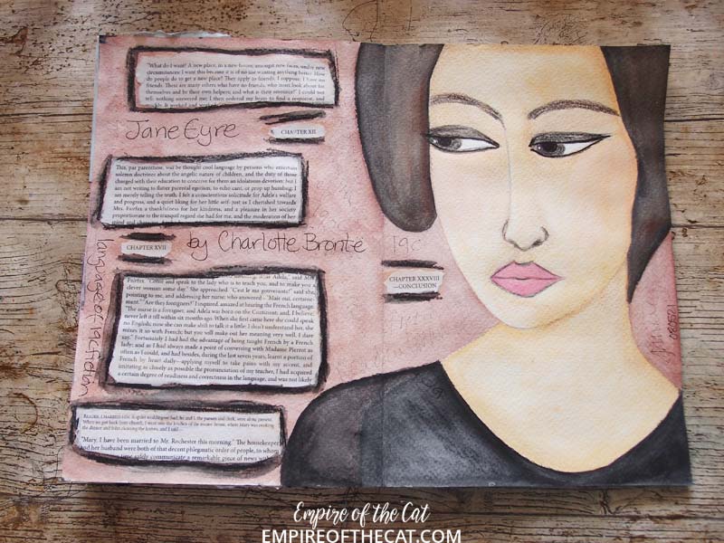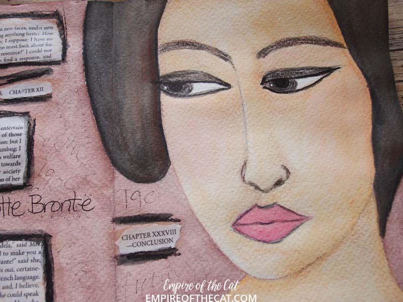 I used my neocolour IIs to “paint” her like I did with the ATC version. Believe it or not the background colour is “Burnt Sienna” though it looks a bit pink. I wanted to use words from the text of the book but I couldn’t bring myself to sacrifice any of the multiple copies of Jane Eyre than I own lol. So, I went to the online version of it, searched the book for the passages I wanted to use and then copy/pasted them into a word document and printed them off!
