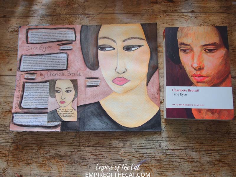 This is the cover for one of the copies of Jane Eyre that I own. Apparently I have at least four copies of this book; I kept finding more of them on the shelves and there might even be more lurking in the depths of the bookcases. So one of my ideas for the language theme was to create a page inspired by the language of 19th Century fiction, so what better example than Jane Eyre. I wondered if I could copy my ATC sized sketch into my journal… This is my second attempt lol, there’s another page in this journal with another version of her that looks worse haha. There’s something not quite right about the angle of her face so she looks different to the ATC version and somehow her nose grew much longer!
