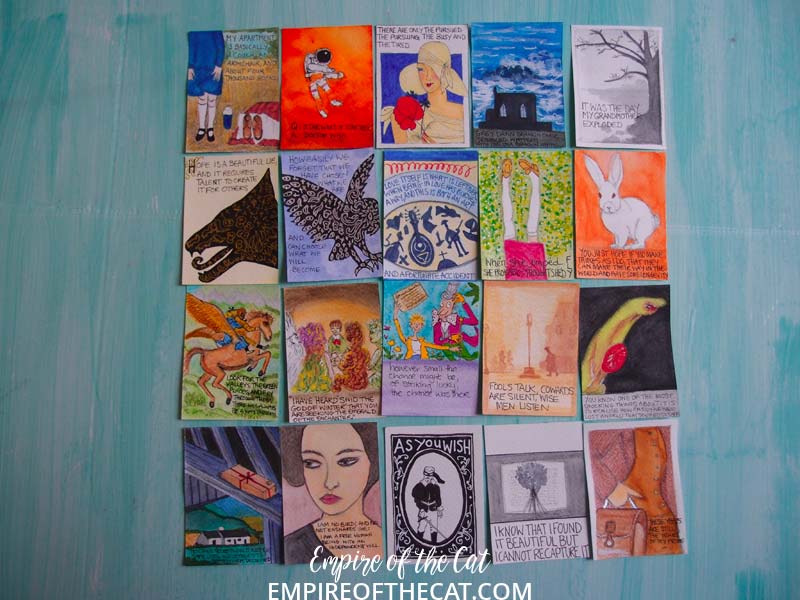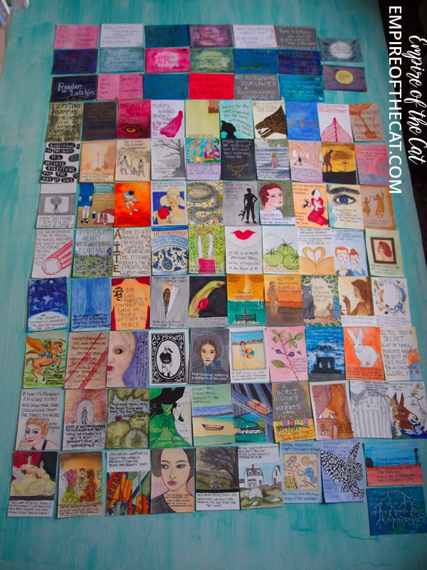 TGI Friday! This has been a rough week after the problems of last week and I am glad it is finally Friday! I’ve had some stressful things to take care of and one more still to come and then maybe I can take a deep breath and relax a bit. As you know, the #100DayProject, ended on Monday 10th, and all 100 of my mini projects are completed and have all been featured in their “10 day” posts but I wanted to find a way to lay all 100 of them out on something flat and photograph them all together. I found a large piece of painted board that was big enough to take them all so here they are all in one place! They are not in date order but the first 20 are at the top and as you can see they are quotes on ATCS which was the original plan, but then around the beginning of the third row I started to incorporate elements from the covers and began to wonder if it was possible to make tiny covers with quotes on them instead of just having the quotes on their own.