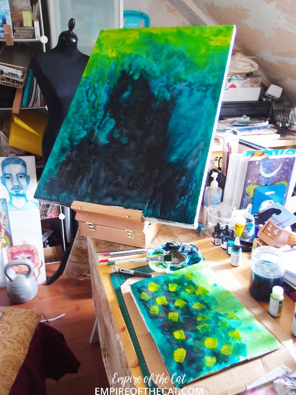 So on Wednesday I shared this photo of my desk and WIP, but what I didn’t say then, was what they were going to become ie this journal page and also this much larger version. The larger version measures 60cm x 85cm which is about 2 feet by a few inches short of 3 feet. I started off using all this dark acrylic ink on both pieces.