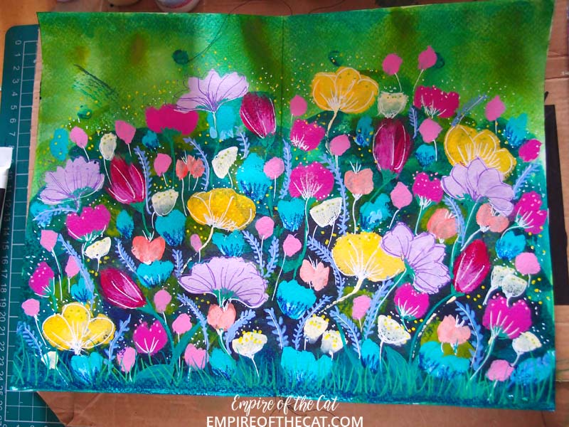 I added a quote to the journal page using a white pen on a scrap of black card. The quote reads “Nature is the common, universal language, understood by all” by Kathleen Raine. Since my page is a flower garden, I couldn’t really use the individual meanings for each flower (plus my flowers are fantasy flowers) so I was thinking more about what a whole garden of flowers would symbolise, and came up with positivity and well-being and peace. Gardens are often used to create peace between people, thinking about community gardens and inclusion, and who doesn’t smile when they see and experience a flower garden (unless they’re allergic of course). Spending time outside in a garden can also positively affect someone’s mood and emotions and their sense of well-being so gardens communicate with us on many levels.