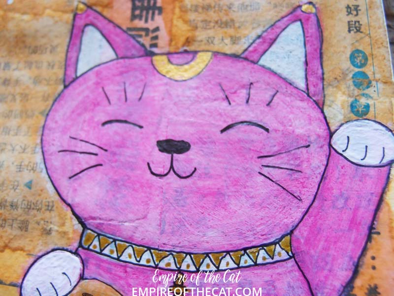 The colour of the cats also has meaning, the traditional white cat is for general good fortune, red is for good health, black is to ward off evil, pink is for romance and gold or yellow is for wealth. I planned to colour one in gold and one pink since part of my background is pink, but then I forgot and painted the whole background in this kind of gold colour so I couldn’t really paint one of my cats gold! So annoyed with myself lol. I didn’t really want a “romance” cat either but I was just going with the background colour of the collage. Really off to a great start!