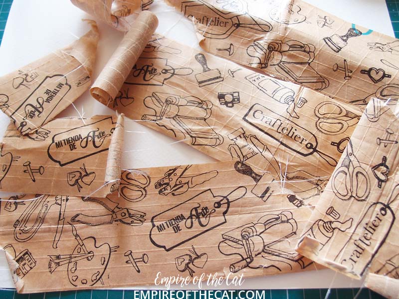 The packing tape has all kinds of arts and crafts represented in picture form plus the name of the company – Craftelier – and also the words Mi Tienda De Arte, which means “my art shop“. I pasted all the pieces of tape onto my page. I like that it’s the kind that has the thread embedded in it.
