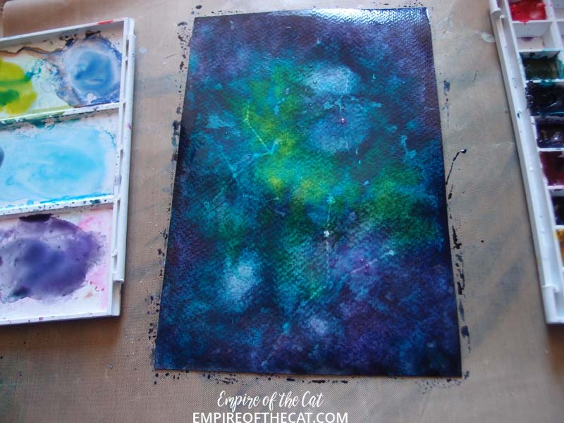 Once the watercolour background is dry, I added some white acrylic paint splatters to represent stars of various sizes. If the constellations are too faint, you can refresh them with the same wax pencil to make them brighter.