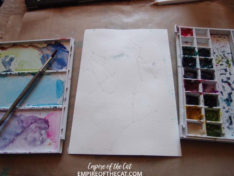 Cut a piece of watercolour paper measuring 5.5 x 8.5 inches. Start the design by drawing in some zodiac constellations. You can find a chart of all zodiac constellations here.
