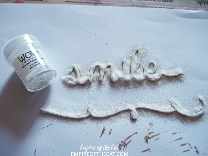 Once the gesso is dry, I used some white embossing powder to heat emboss the word and the curly tail.