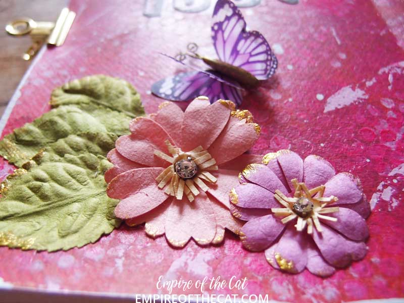 I found these Prima flowers in my stash and the packet also contained this lovely butterfly with a metal body and two layers of wings, which are open for the photo but will lie flat when the journal is closed, so no worries about crushing it.