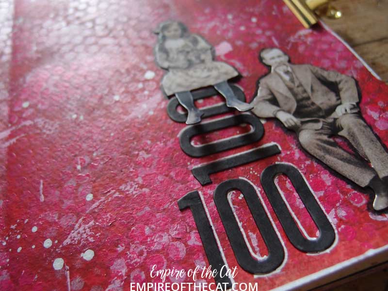 I used the idea of the paper doll sitting on top of the big 100 but for mine, I stacked 2 x 100 on top of each other to make them taller, using the Shadow Numbers die from Tim Holtz, and added two paper dolls, one old, one young.