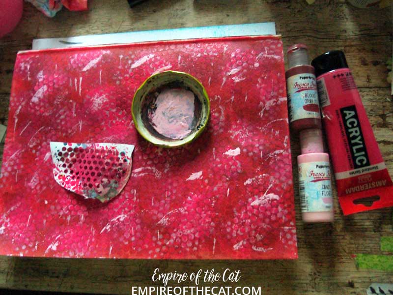 I continued to add layers of stencilling using Paperartsy Blood Orange and Candy Floss chalk paints. The photo below show my old cardboard stencil and a jar lid I was using as a palette, plus the paints I was using. It’s all high tech around here lol.
