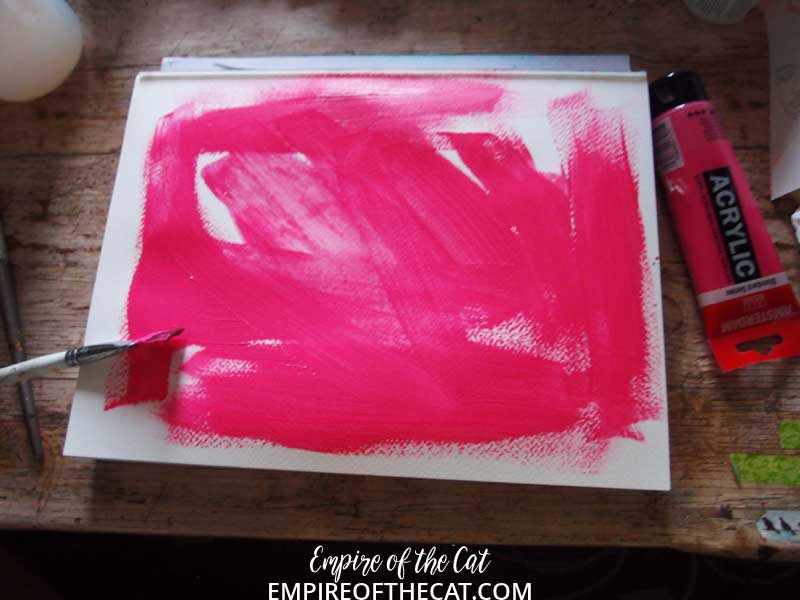 I chose this one because I liked the paper doll sitting on the big 100, and I thought the colour would be a bit of a challenge for me as it looked quite dark and reddish and that’s not my usual colour choice. I don’t have the same products so I started off with this Quin Rose acrylic from Amsterdam.