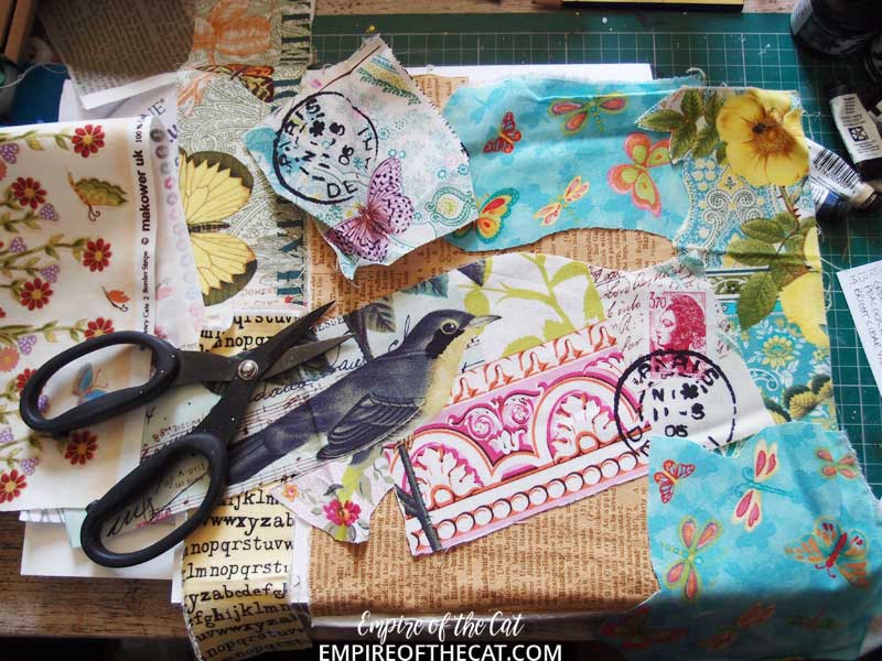 Hi everyone, and happy Tuesday! Today I am sharing an art journal page that is almost completely made from fabric! I was invited to be Guest Designer over on Try It On Tuesday, for their new challenge theme Feathered Friends which starts today. As soon as I saw what the theme was going to be, I immediately got an idea for what I wanted to do, the only problem was trying to find the fabric I wanted to use, as things are still a bit chaotic here after switching everything around. Eventually I found the one, plus a few more pieces I thought might work well. Here’s my shortlist of potential fabrics pieces…