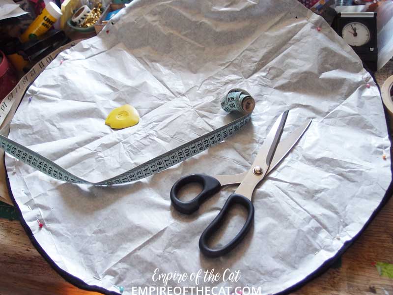 If he wants a bed, he will push her off or out of it so I knew there had to be two of them.  And as I said, he’s enormous (nearly 8kg) so they needed to be BIG.  I drew up a circle that measured 24 inches and cut it out of Burda tissue paper, this will allow for seam allowance and will result in a decent sized bed.
