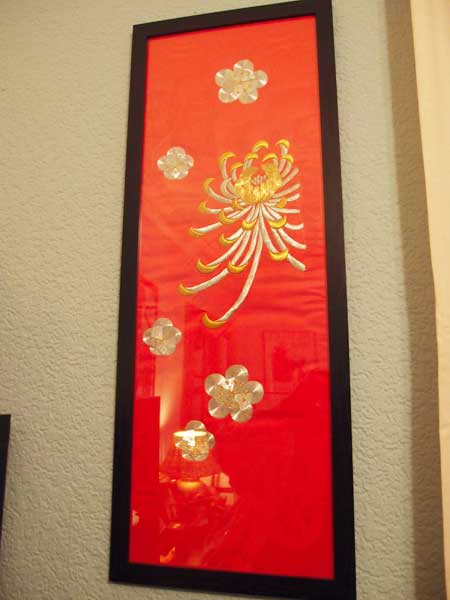 This one I really love! It’s a long piece of red kimono, with gold and silver embroidery on it of cherry blossoms and chrysanthemums. This piece I really didn’t to cut, so I managed to find a frame on amazon that would fit it nicely.