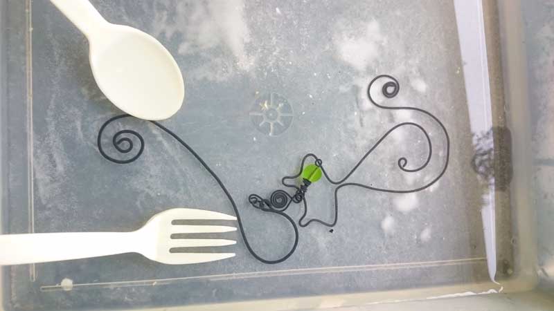 I made two cats and two shepherd’s crooks – one with the green bead and one with the amber bead. However, after I had hammered them, I felt they were too shiny and so to add some depth and interest, I dunked them in a liver of sulphur bath.