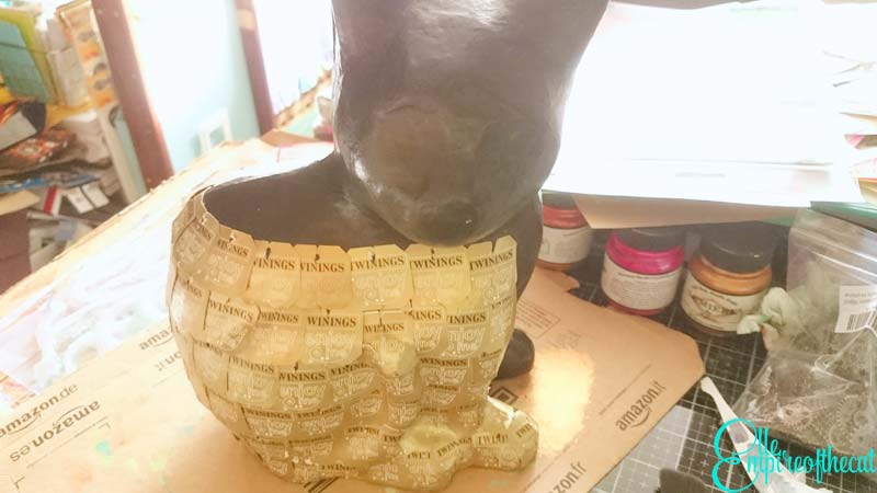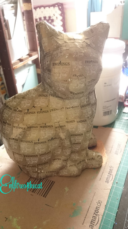 So in order to protect my papier mache cat from the tiny teeth of marauding kitties, I covered it in black gesso. She was less impressed with the favour of that! It was then time to start the decoupage with the teabag tags.