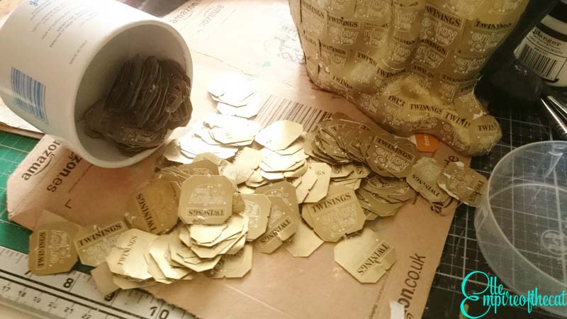 My inspiration came from two things, one being all of these teabag tags I’ve been collecting since last year because they are shiny gold and I love tea.